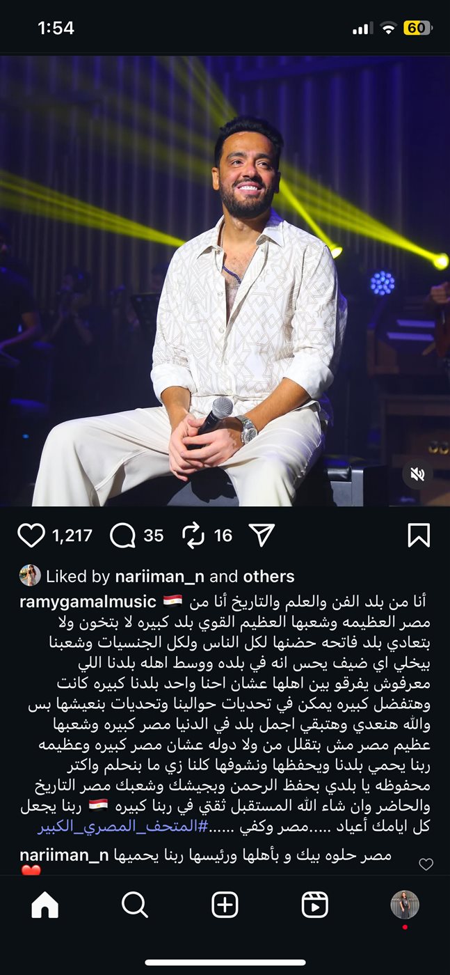 وقال المطرب رامي جمال في منشوره: “أنا من بلد الفن والعلم والتاريخ، أنا من مصر العظيمة وشعبها العظيم القوي، بلد كبيرة لا بتخون ولا بتعادي، بلد فاتحة حضنها لكل الناس ولكل الجنسيات وشعبنا بيخلي اي ضيف يحس أنه في بلده ووسط اهله بلدنا اللي معرفوش يفرقو بين اهلها عشان احنا واحد، بلدنا كبيرة كانت وهتفضل كبيرة، يمكن في تحديات حوالينا وتحديات بنعيشها بس والله هنعدي وهتبقي اجمل بلد في الدنيا مصر كبيرة وشعبها عظيم مصر مش بتقلل من ولا دولة عشان مصر كبيرة وعظيمة، ربنا يحمي بلدنا ويحفظها ونشوفها كلنا زي ما بنحلم واكتر، محفوظة يا بلدي بحفظ الرحمن وبجيشك وشعبك، مصر التاريخ والحاضر وان شاء اللّٰه المستقبل ثقتي في ربنا كبيرة، ربنا يجعل كل ايامك أعياد، مصر وكفي، المتحف المصري الكبير”.