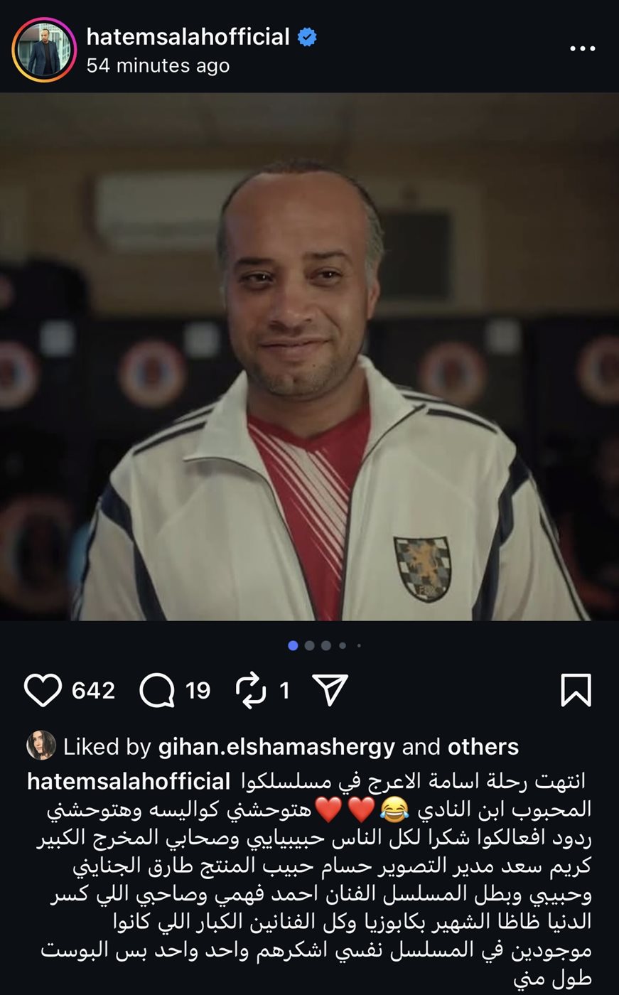 وعلق حاتم صلاح على منشوره قائلًا: “انتهت رحلة اسامة الاعرج في مسلسلكوا المحبوب ابن النادي، هتوحشني كواليسه وهتوحشني ردود افعالكوا، شكرا لكل الناس حبيبيايي وصحابي المخرج الكبير كريم سعد مدير التصوير حسام حبيب المنتج طارق الجنايني، وحبيبي وبطل المسلسل الفنان احمد فهمي وصاحبي اللي كسر الدنيا ظاظا الشهير بكابوزيا، وكل الفنانين الكبار اللي كانوا موجودين في المسلسل نفسي اشكرهم واحد واحد بس البوست طول مني”.