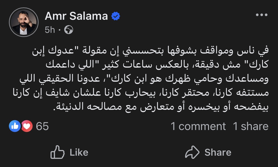 حيث قال المخرج عمرو سلامة من خلال منشوره: "في ناس ومواقف بشوفها بتحسسني إن مقولة "عدوك إبن كارك" مش دقيقة، بالعكس ساعات كثير "اللي داعمك ومساعدك وحامي ظهرك هو ابن كارك"، عدونا الحقيقي اللي مستتفه كارنا، محتقر كارنا، بيحارب كارنا علشان شايف إن كارنا بيفضحه أو بيخسره أو متعارض مع مصالحه الدنيئة."