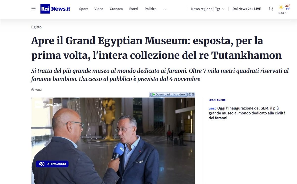 بثّ تلفزيون Rai News 24 الإيطالي اليوم، السبت، تقريرًا مصورًا من منطقة أهرامات الجيزة والمتحف المصري الكبير، استعرض خلاله مشاهد حصرية من الاستعدادات الأخيرة قبيل افتتاح المتحف الذي يترقبه العالم مساء اليوم في حدث يوصف بأنه الأكبر في تاريخ المتاحف الحديثة.
