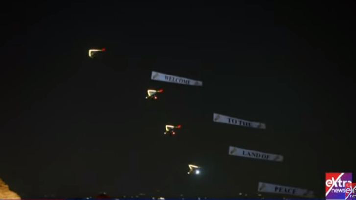 في مشهد حافل حلّقت الطائرات مزينة السماء بعبارات ترحيبية، خلال حفل افتتاح المتحف المصري الكبير أعلى أهرامات الجيزة، إذ حملت لافتة كبيرة كتب عليها: "مرحبًا بكم في أرض السلام".