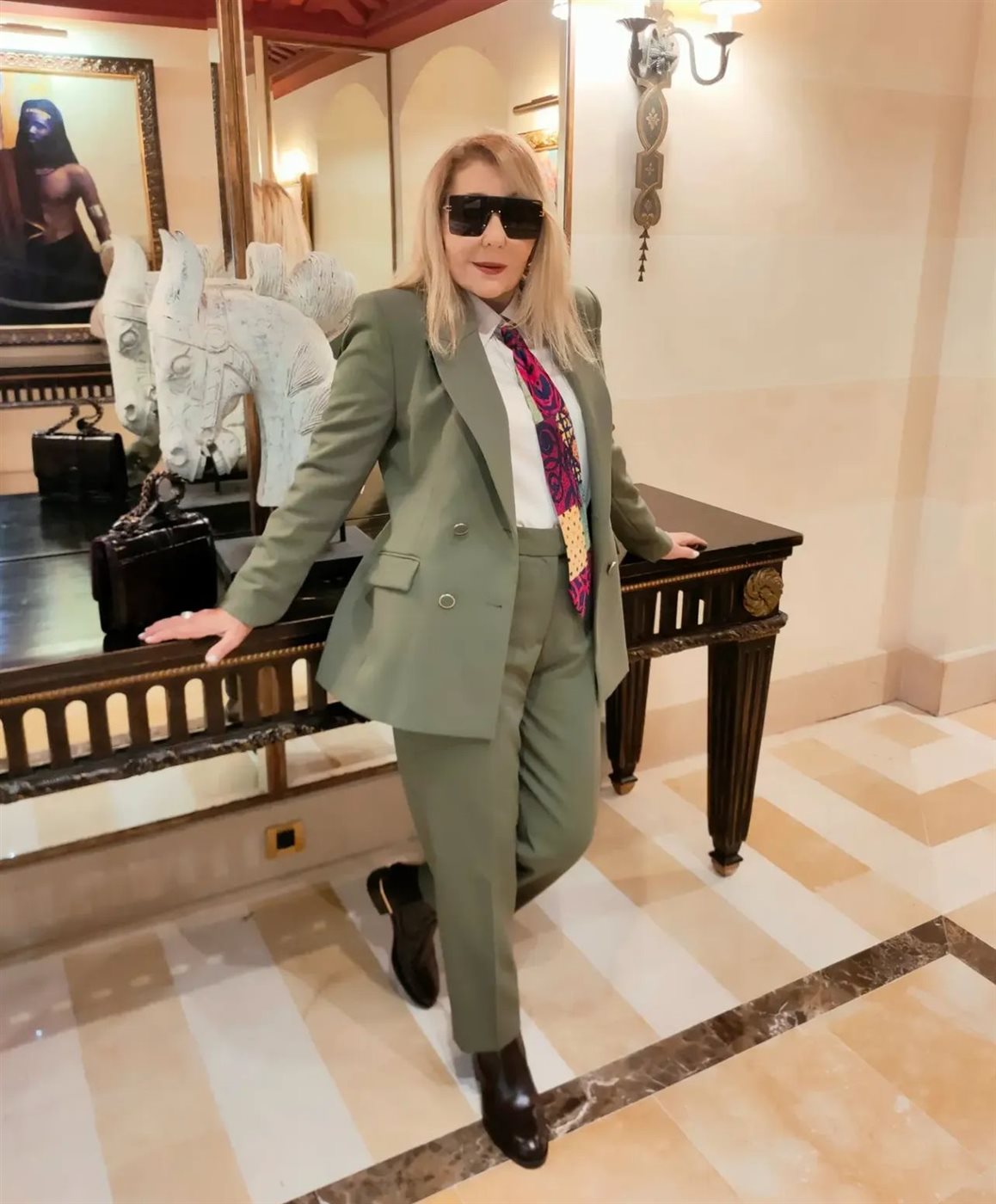 ظهرت نادية الجندي ببدلة باللون الأخضر الفاتح مع ربطة عنق تدمج العديد من الألوان، ونسقت معها حذاء باللون الأسود ونظارة شمسية.