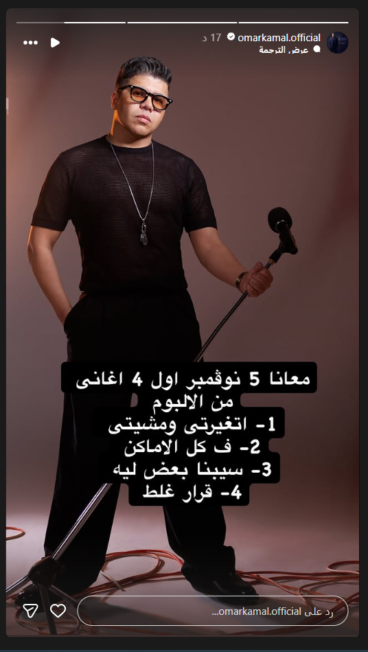 أثار المطرب عمر كمال الجدل بعدما أعلن عن طرح أول 4 أغاني من ألبومه الجديد، وسوف يتم طرحهم يوم 5 من شهر نوفمبر الجاري، والأغاني هي: اتغيرتي ومشيتي، في كل الأماكن، سيبنا بعض ليه، قرار غلط، وقد أعلن عن ذلك من خلال منشورًا عبر خاصية الأستوري على حسابه الرسمي بموقع تبادل الصور والفيديوهات إنستجرام.