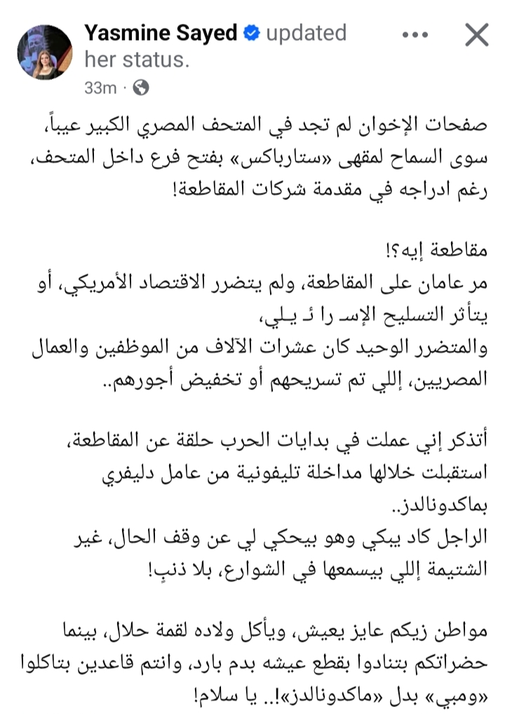 وقالت الخطيب في منشور لها عبر حسابها على موقع التواصل الاجتماعي فيسبوك: "صفحات الإخوان لم تجد في المتحف المصري الكبير عيباً، سوى السماح لمقهى «ستاربكس» بفتح فرع داخل المتحف، رغم إدراجه في مقدمة شركات المقاطعة!".