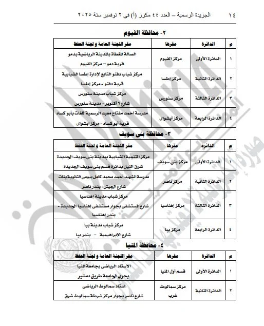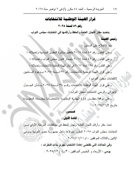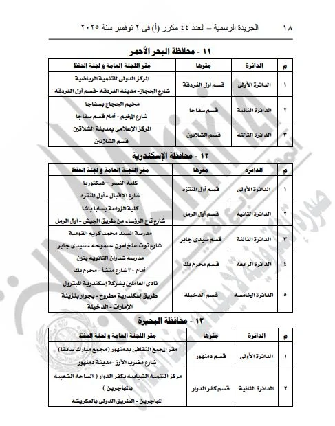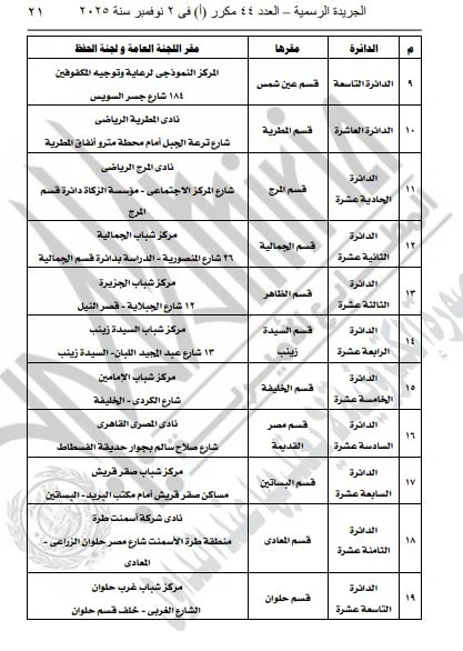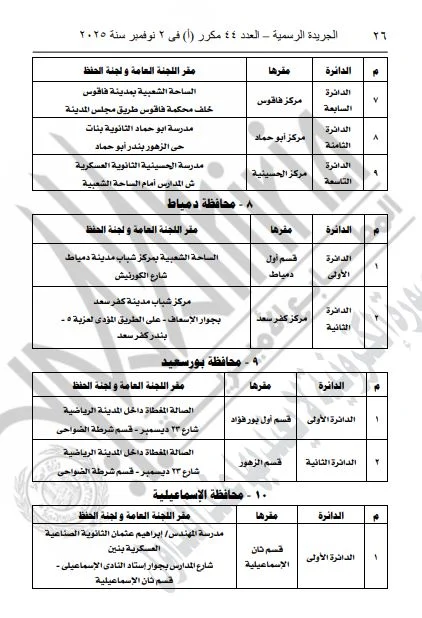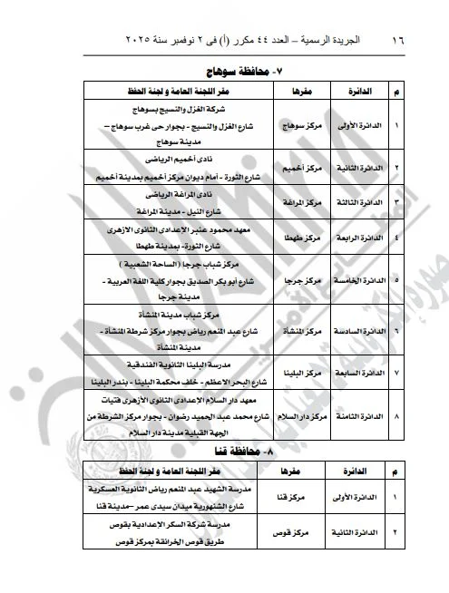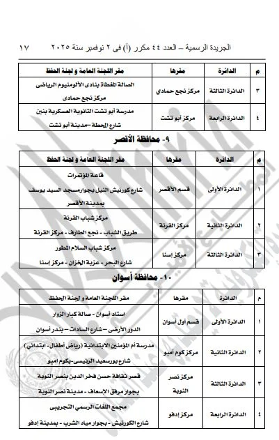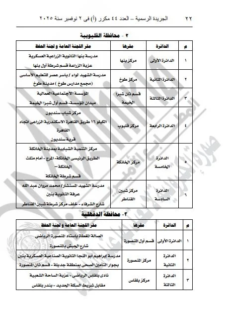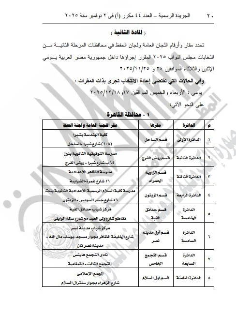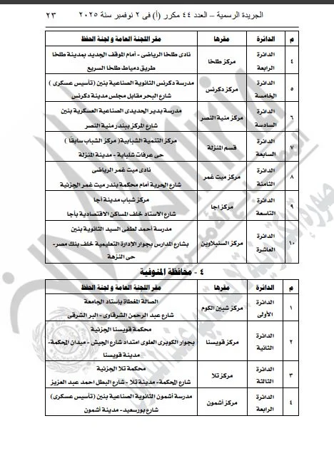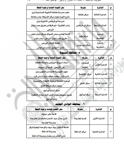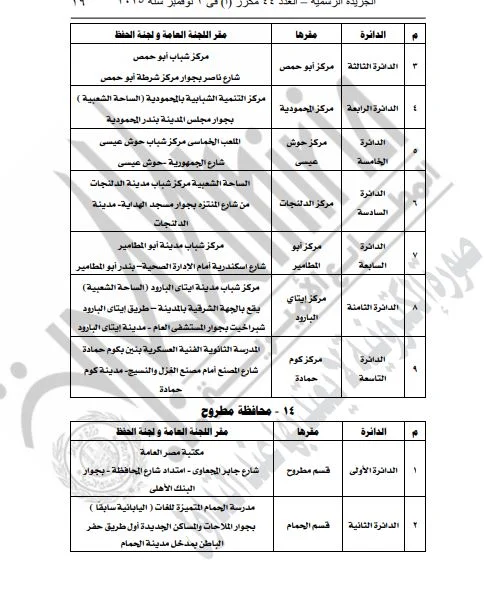 ونشرت الجريدة الرسمية القرار الذي تضمن تفاصيل المقار المخصصة للجان العامة ولجان الحفظ، بالإضافة إلى أرقام هذه اللجان، وذلك لكلا المرحلتين الأولى والثانية من الانتخابات.