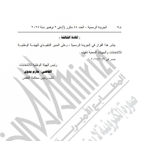 وتؤكد الهيئة الوطنية للانتخابات على ضرورة متابعة المواطنين للإعلانات الرسمية والقرارات المنشورة في الجريدة الرسمية، والبقاء على اطلاع على أرقام ومقار اللجان الخاصة بهم، تحسبًا لأي تحديثات أو تغييرات محتملة قد تطرأ قبل يوم الانتخابات.