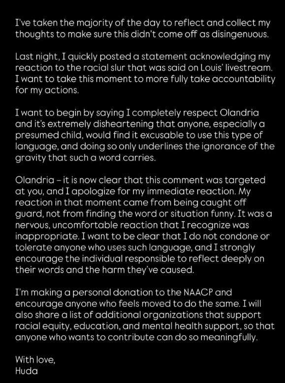 في بيان رسمي نُشر عبر حساب هدى بيوتي في إنستجرام، أكدت العلامة: "في هدى بيوتي، اللطف والإنسانية هما جوهر كل ما نقوم به. للأسف، أظهرت إحدى المتعاونات معنا سلوكاً لا يتماشى مع قيمنا."