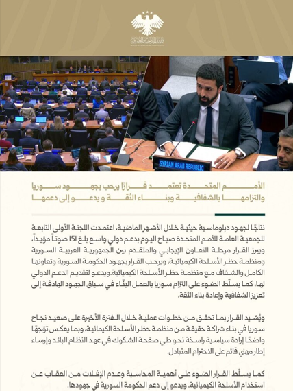 وأوضحت الوزارة أن القرار، الذي اعتمدته اللجنة الأولى للجمعية العامة للأمم المتحدة بأغلبية واسعة بلغت 151 صوتًا مؤيدًا، يعكس مرحلة متقدمة من التعاون الإيجابي بين سوريا ومنظمة حظر الأسلحة الكيميائية، ويبرز التزام دمشق بالعمل البناء لتعزيز الشفافية وإعادة بناء الثقة على المستوى الدولي.
