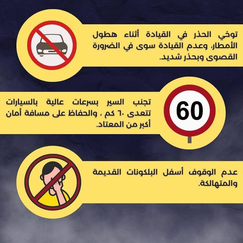 وضرورة تجنب استخدام الهواتف السلكية أو المعدات الكهربائية أثناء البرق، وعلى قائدي المركبات تخفيف السرعة والالتزام بالمسارات المحددة لتفادي الحوادث.