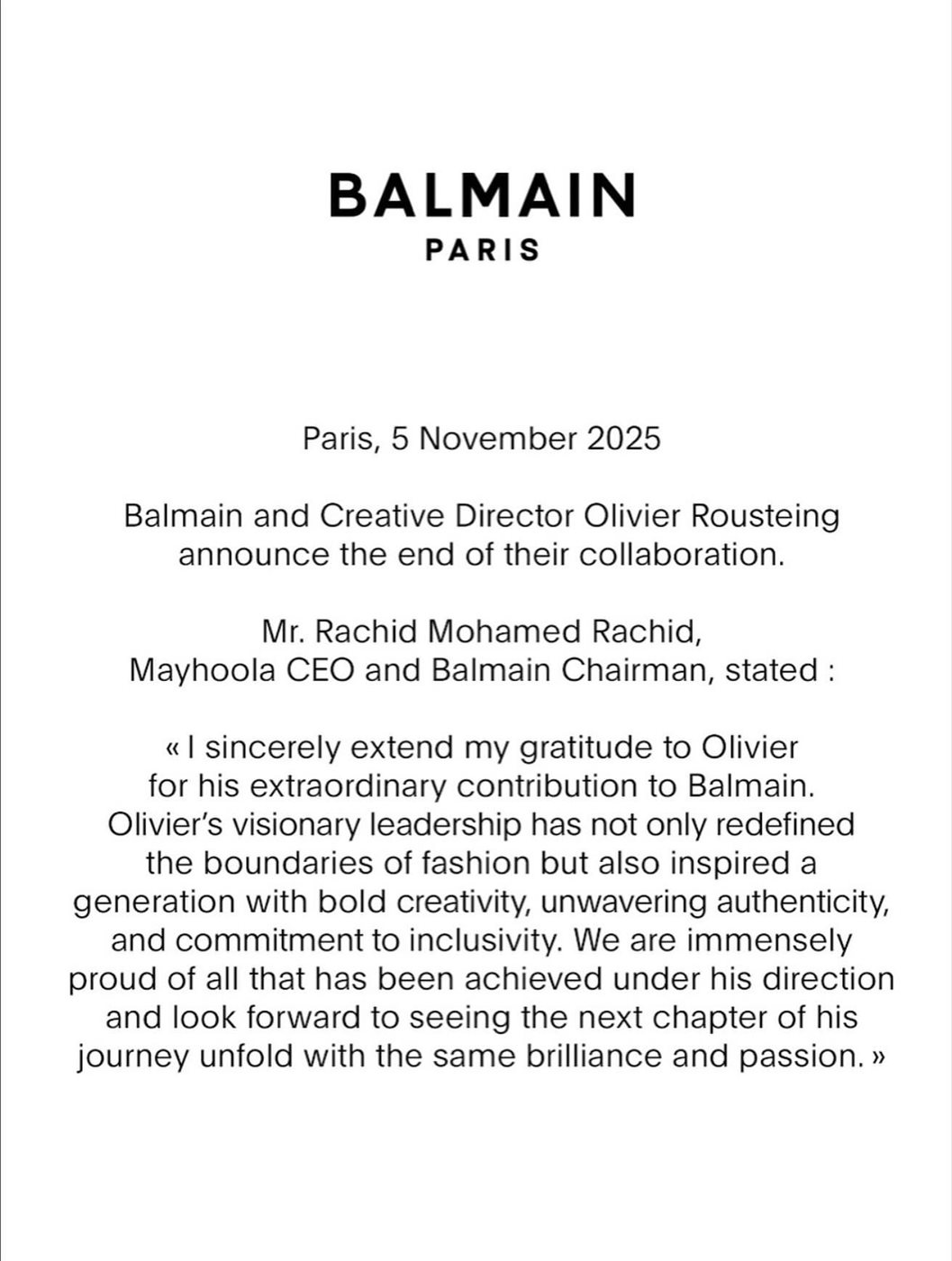 كما قال ماتيو سغاربوسا، الرئيس التنفيذي لدار بالمان: “أود أن أعبّر عن بالغ امتناني لأوليفييه على كتابته فصلاً مهماً في تاريخ الدار. إن مساهماته وشغفه عبر السنوات ستبقى علامة لا تُمحى في تاريخ الموضة”.