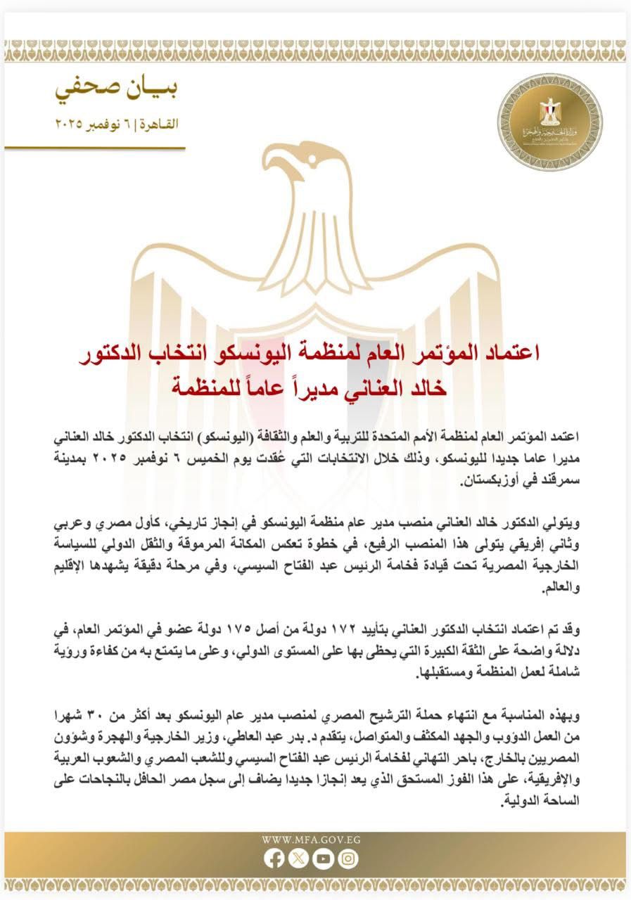 قالت وزارة الخارجية، إن المؤتمر العام لمنظمة الأمم المتحدة للتربية والعلم والثقافة (اليونسكو)، اعتمد انتخاب الدكتور خالد العناني مديرًا عامًا جديدًا لليونسكو، وذلك خلال الانتخابات التي عقدت يوم الخميس 6 نوفمبر 2025، بمدينة سمرقند في أوزبكستان.