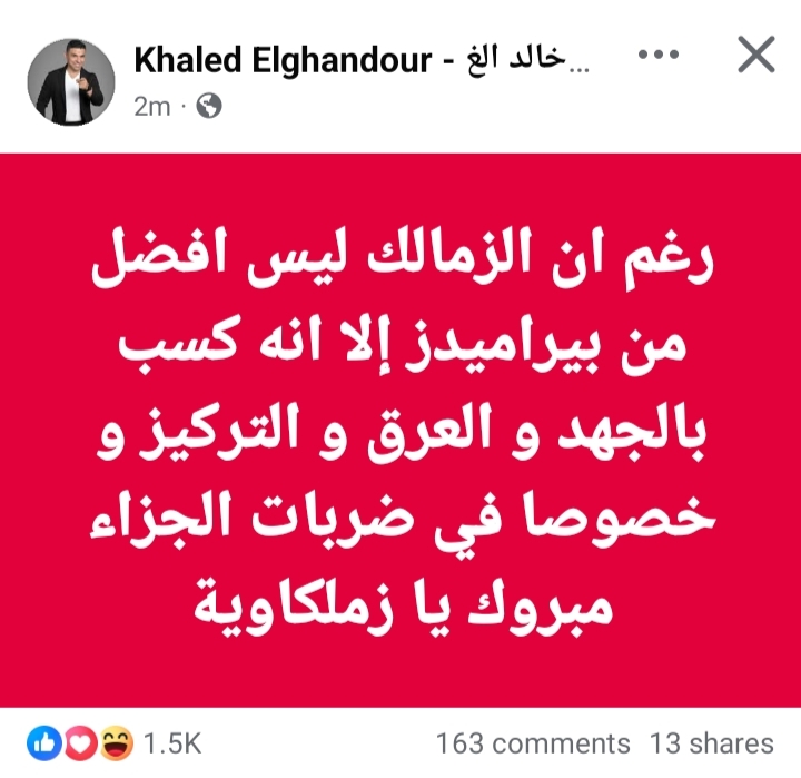 وعلق الغندور على فوز المارد الأبيض في منشور له عبر حسابه على موقع التواصل الاجتماعي فيسبوك، قائلاً: "رغم إن الزمالك ليس أفضل من بيراميدز، إلا إنه كسب بالجهد والعرق والتركيز وخصوصا في ضربات الجزاء.. مبروك يا زملكاوي".