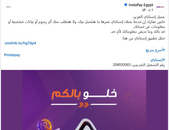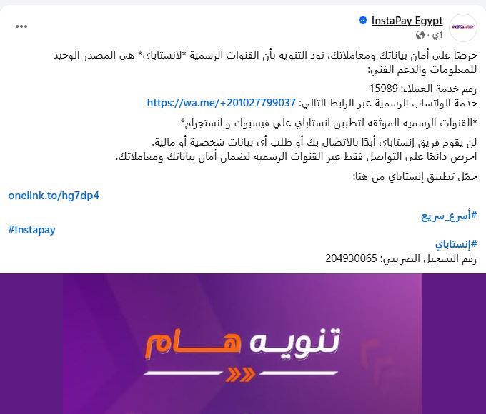 - الصفحات الرسمية الموثقة لتطبيق إنستاباي على فيسبوك وإنستجرام