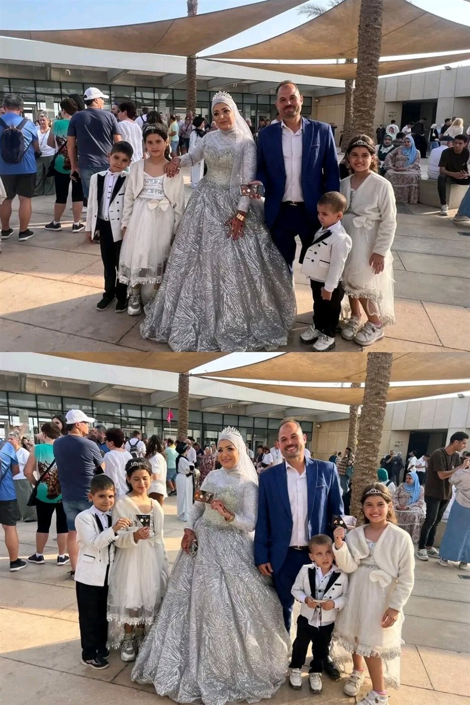 وحرص الزوجان على الظهور بكامل أناقتهما، وارتدى الزوج بدلة أنيقة، وتألقت زوجته بفستان أبيض.