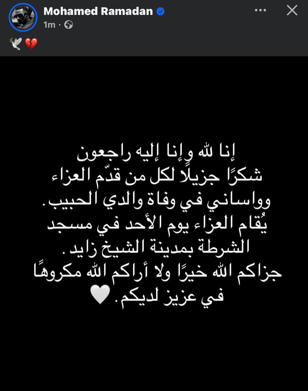وكتب رمضان: “إنا لله وإنا إليه راجعون شكرًا جزيلا لكل من قدم العزاء وواساني في وفاة والدي الحبيب، ويُقام العزاء يوم الأحد في مسجد الشرطة بمدينة الشيخ زايد، وجزاكم اللّٰه خيرًا ولا أراكم اللّٰه مكروها في عزيز لديكم”.