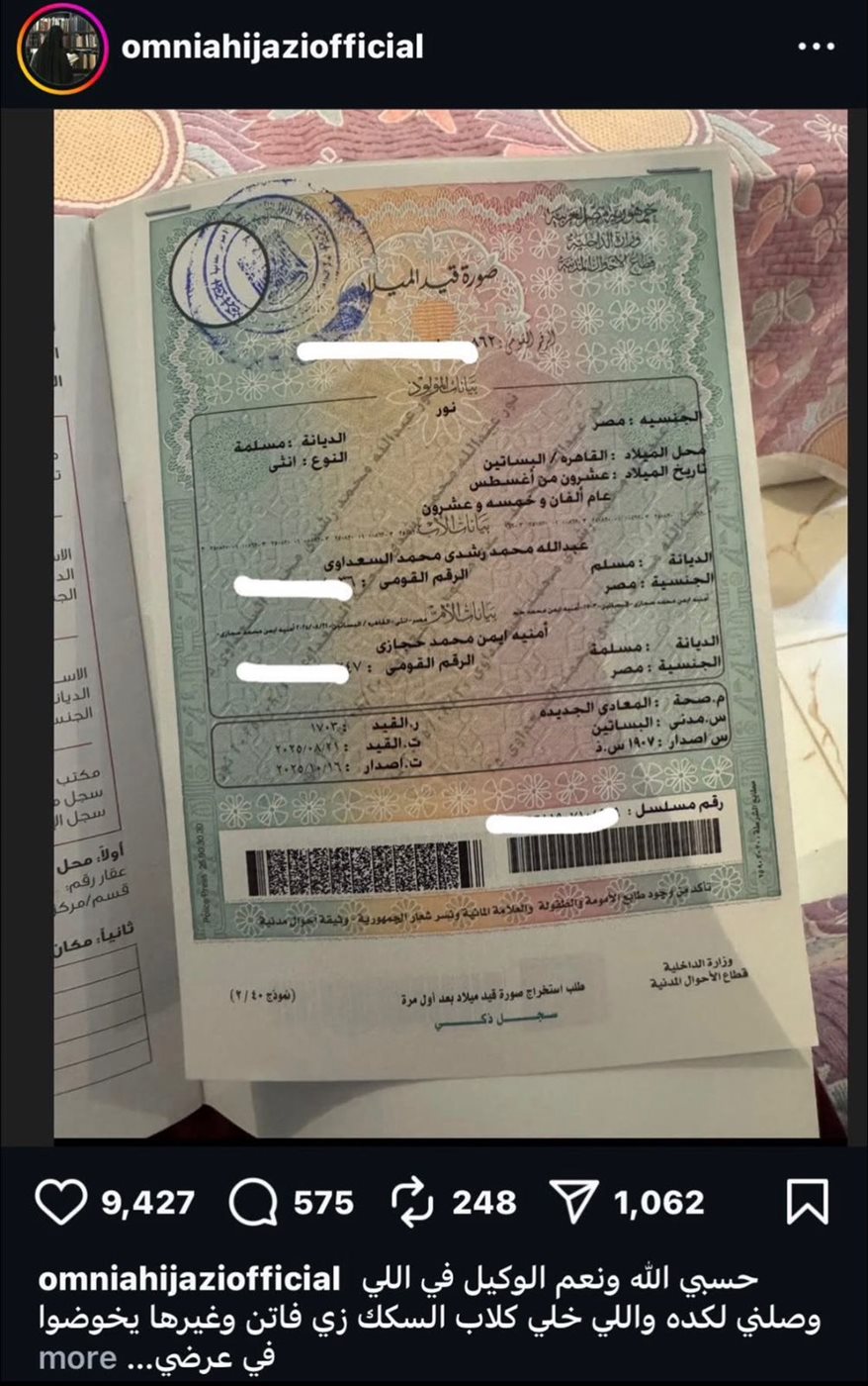 وجاء منشور ياسمين الخطيب بعدما نشرت البلوجر أمنية حجازي، شهادة ميلادة لطفلة تدعى “نور عبدالله محمود رشدي”، وأن والدتها أميمة أيمن حجازي، مدعية أن الصغيرة هي ابنة الداعية عبدالله رشدي، وأنها هي زوجة له.