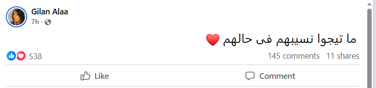 في لافتة مثيرة للجدل ورسالة غامضة، طالبت الفنانة جيلان علاء جمهورها بتجاهل أنباء الارتباط التي تلاحق الثنائي كريم محمود عبدالعزيز ودينا الشربيني، ولكنها لم تكشف عن أساميهم فاكتفت بوضع منشورًا عبر حسابها الرسمي على موقع التواصل الإجتماعي فيسبوك، وقالت في منشورها: “ما تيجوا نسيبهم فى حالهم”.