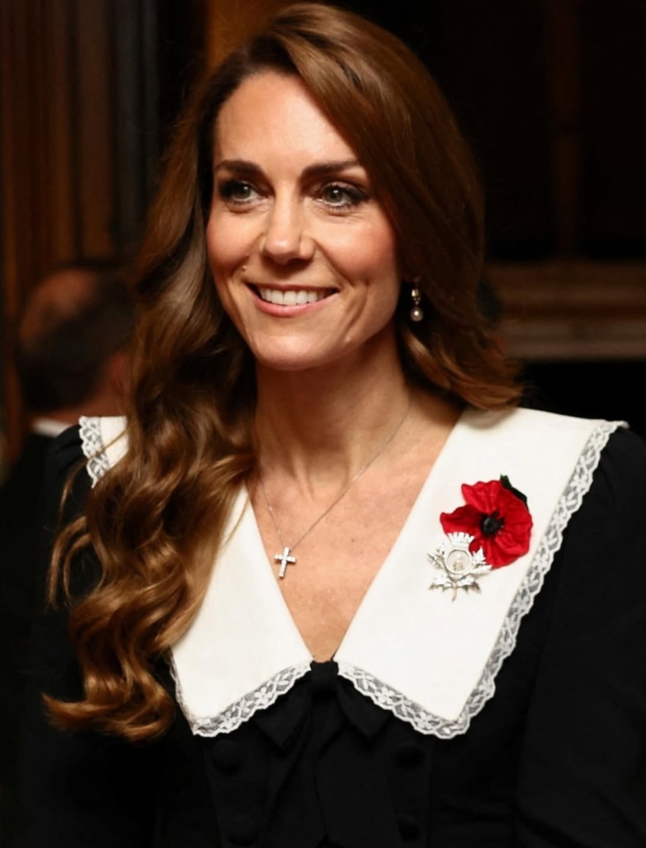 اختارت كيت لهذه المناسبة إطلالة سوداء أنيقة من دار Alessandra Rich التزمت فيها بتقاليد الحداد الملكي، ونسّقتها مع حقيبة Mulberry من الجلد السويدي. أما الرمزيات فكانت لافتة ومدروسة قرطا لؤلؤ البحرين العائدان للملكة إليزابيث الثانية استحضاراً للإرث العائلي، وزهرة الخشخاش اليدوية من تصميم خريجة شابة دعماً للحرفيين البريطانيين، وبروش الشوك الفضي الاسكتلندي تعبير عن وحدة المملكة وتنوع رموزها التاريخية