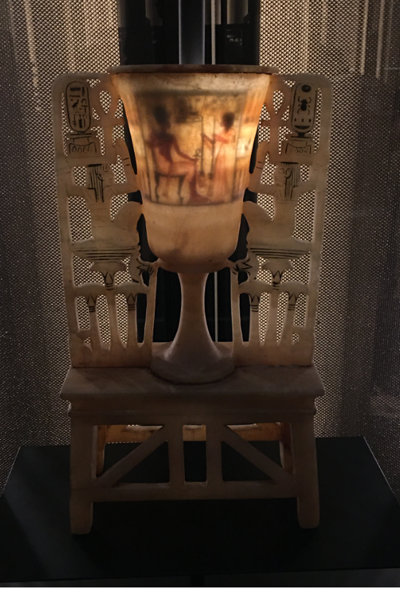أما عن المصباح فكشف المتحف أن تصميمه جاء على شكل زهرة اللوتس، المحاطة بهيئتين للمعبود حج، بينما هو جالس على نباتات البردي، المُثبتة بدورها على قاعدة تشبه الطاولة، ويظهر منظر يمثل توت عنخ آمون وزوجته عنخ إس إن آمون، عند إضاءة هذا المصباح بين طبقتين من الألباسـتر المصري"