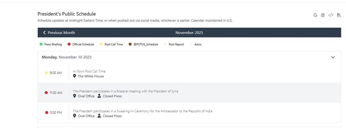 من المقرر أن يلتقي ترامب والشرع في الساعة 6 مسا بتوقيت القاهرة، وتعد هذه الزيارة الأولى لرئيس سوري إلى البيت الأبيض منذ عقود، وتأتي بعد قرار واشنطن رفع اسم الرئيس الشرع ووزير الداخلية أنس خطاب من قوائم العقوبات الأمريكية، وذلك عقب مشاركته في اجتماعات الجمعية العامة للأمم المتحدة في نيويورك خلال سبتمبر الماضي.