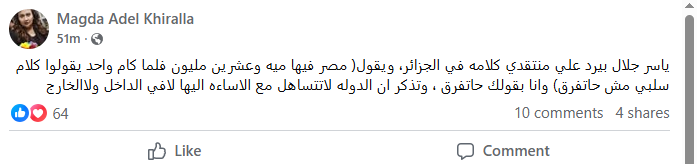 وقالت ماجدة خيرالله في منشورها: “ياسر جلال بيرد علي منتقدي كلامه في الجزائر، ويقول (مصر فيها مية وعشرين مليون فلما كام واحد يقولوا كلام سلبي مش حاتفرق)، وانا بقولك حاتفرق ، وتذكر أن الدولة لا تتساهل مع الإساءة إليها لا في الداخل ولا الخارج”,