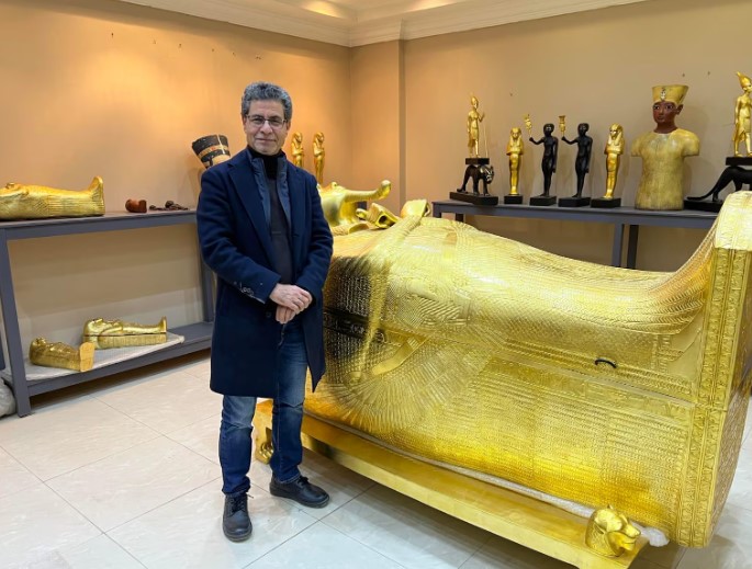 وعُرف هذا الفنان المصري مصطفى العزبي، بإنتاج نسخ عالية الدقة من مقتنيات الفراعنة، باستخدام خامات ومينا وألوان تحاكي تفاصيل القناع الذهبي الأصلي المعروض في المتحف المصري الكبير.