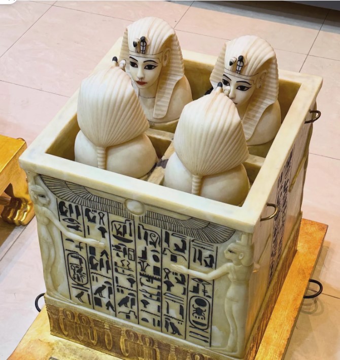 إلى جانب القناع، عرض العزبي نسخة دقيقة من رأس الملك توت على هيئة الإله نفرتم بسعر 3 آلاف دولار، وصندوقًا كانوبيًا بالحجم الأصلي مقابل 25 ألف دولار، مؤكدًا إمكانية تنفيذ نسخة كاملة من المقبرة الشهيرة، التي اكتُشفت عام 1922 بوادي الملوك في الأقصر.