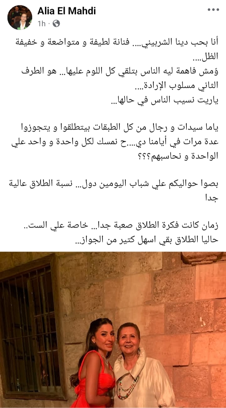 وقالت الماضي في منشور عبر موقع التواصل الاجتماعي "فيسبوك": "أنا بحب دينا الشربيني، فنانة لطيفة و متواضعة و خفيفة الظل، وًمش فاهمة ليه الناس بتلقي كل اللوم عليها، هو الطرف الثاني مسلوب الإرادة، ياريت نسيب الناس في حالها".