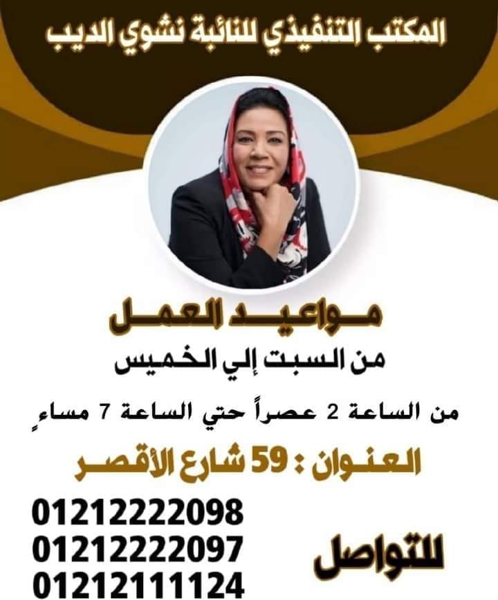 وجاءت مواعيد عمل المكتب التنفيذي وخدمة المواطنين للنائبة نشوى الديب، كما يلي:-
