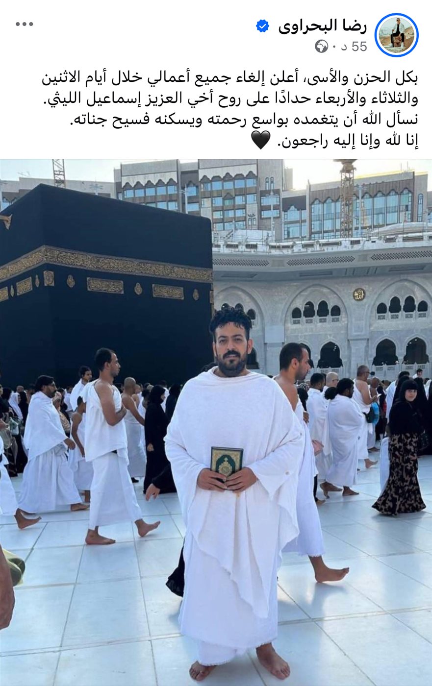 وكتب رضا البحراوي : بكل الحزن والأسى، أعلن إلغاء جميع أعمالي خلال أيام الاثنين والثلاثاء والأربعاء حدادًا على روح أخي العزيز إسماعيل الليثي.. نسأل الله أن يتغمده بواسع رحمته ويسكنه فسيح جناته.. إنا لله وإنا إليه راجعون.