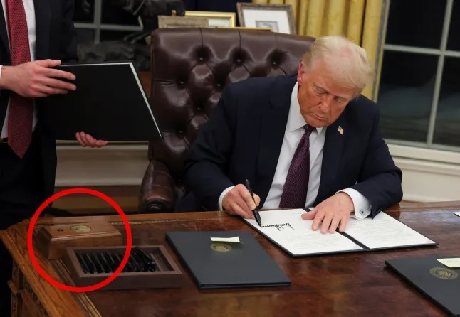 وبعد ساعات من طلبه، ظهرت صورة للزر على الجانب الأيمن من المكتب عندما وقع ترامب على مجموعة من الأوامر التنفيذية لدى عودته إلى المكتب.