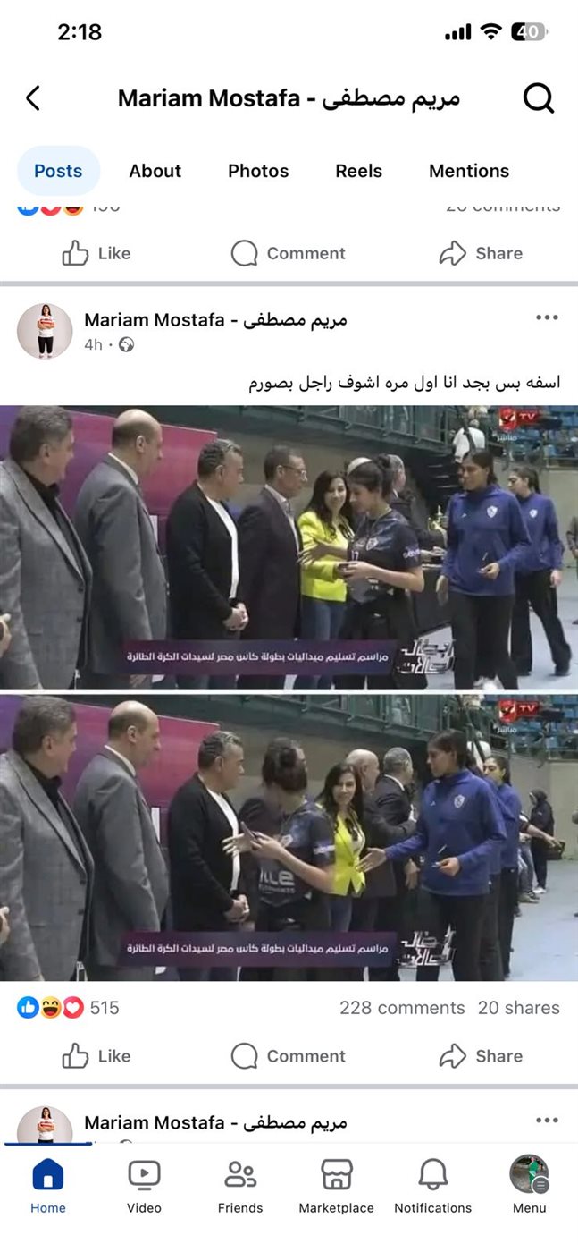 ونشرت اللاعبة صورة قديمة لها خلال صعودها لمنصة التتويج مع الفريق بإحدى النهائيات، وتعرضت اللاعبة حينها لموقف محرج بعدما رفض الكابتن خالد مرتجي مصافحتها.