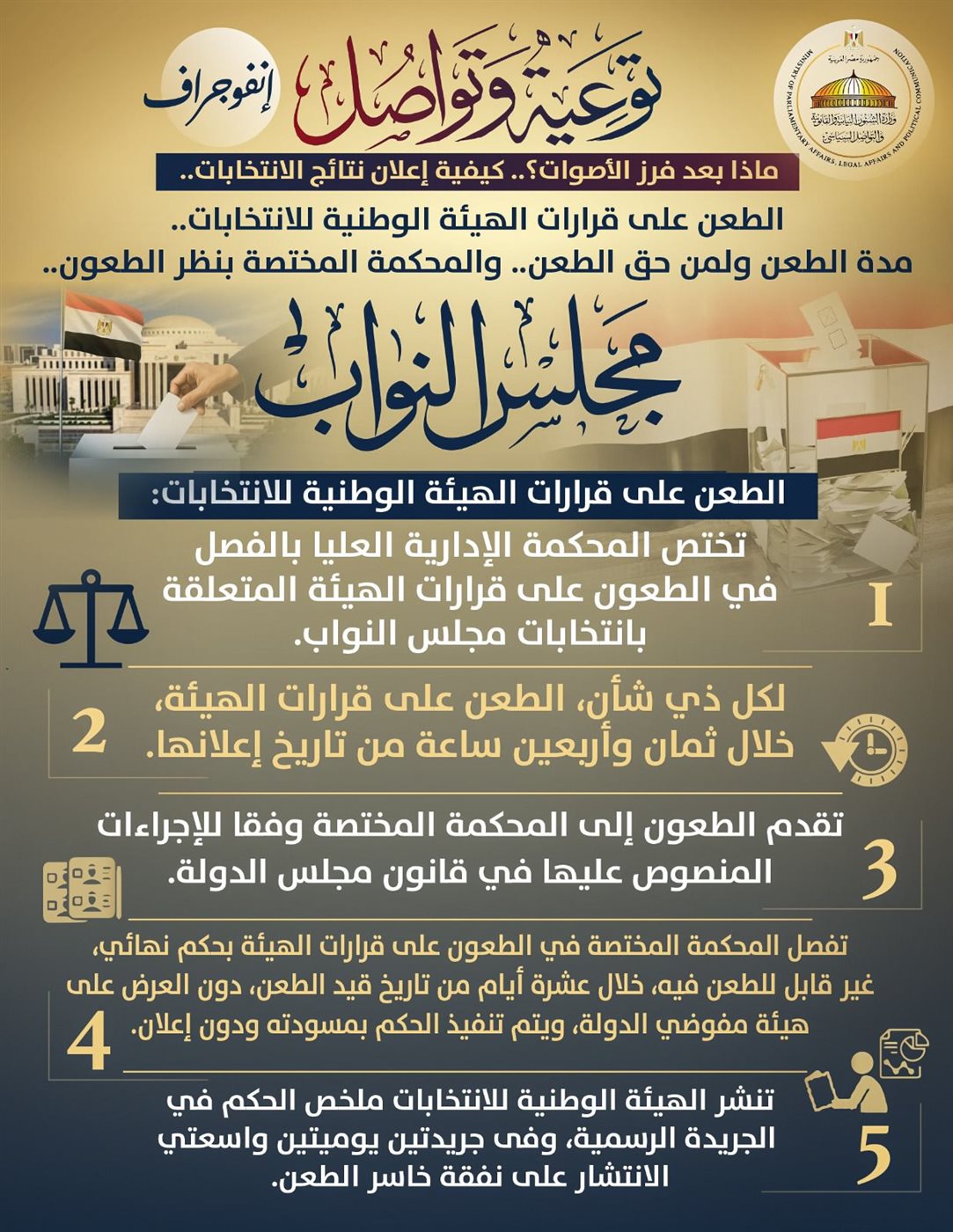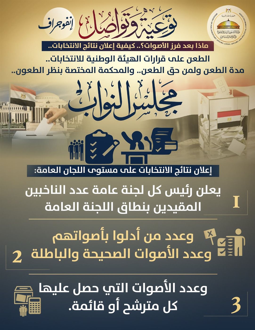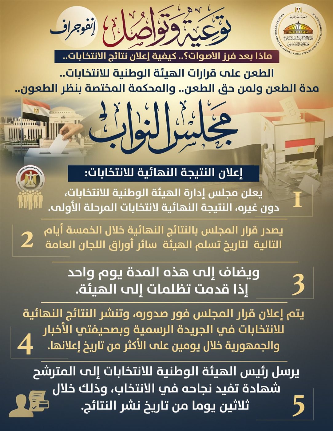 أصدرت وزارة الشؤون النيابية والقانونية والتواصل السياسي بيانًا اليوم الأربعاء 12 نوفمبر 2025، قالت فيه إنه استمرارًا لسلسلة المحتوى التوعوي الذي بدأته الوزارة تحت شعار "توعية وتواصل"، نشرت اليوم مجموعة إنفوجرافات سياسية توعوية قدمت فيها معلومات بشأن مراحل ما بعد فرز الأصوات في انتخابات مجلس النواب، وكيفية إعلان نتائج الانتخابات.. الطعن على قرارات الهيئة الوطنية للانتخابات.. مدة الطعن ولمن حق الطعن.. والمحكمة المختصة بنظر الطعون.