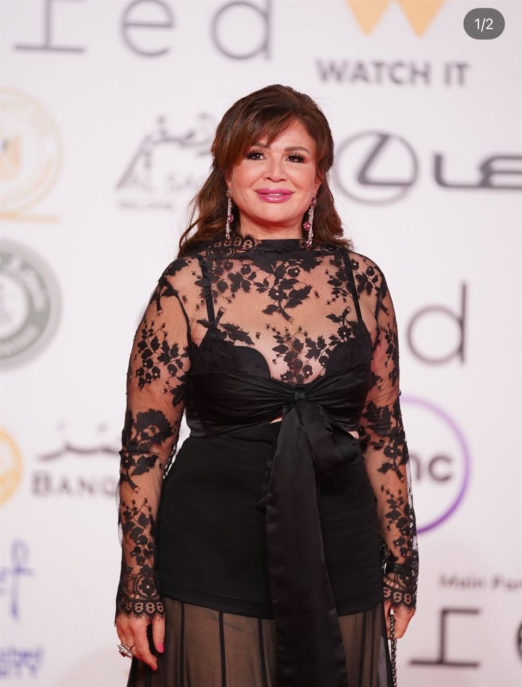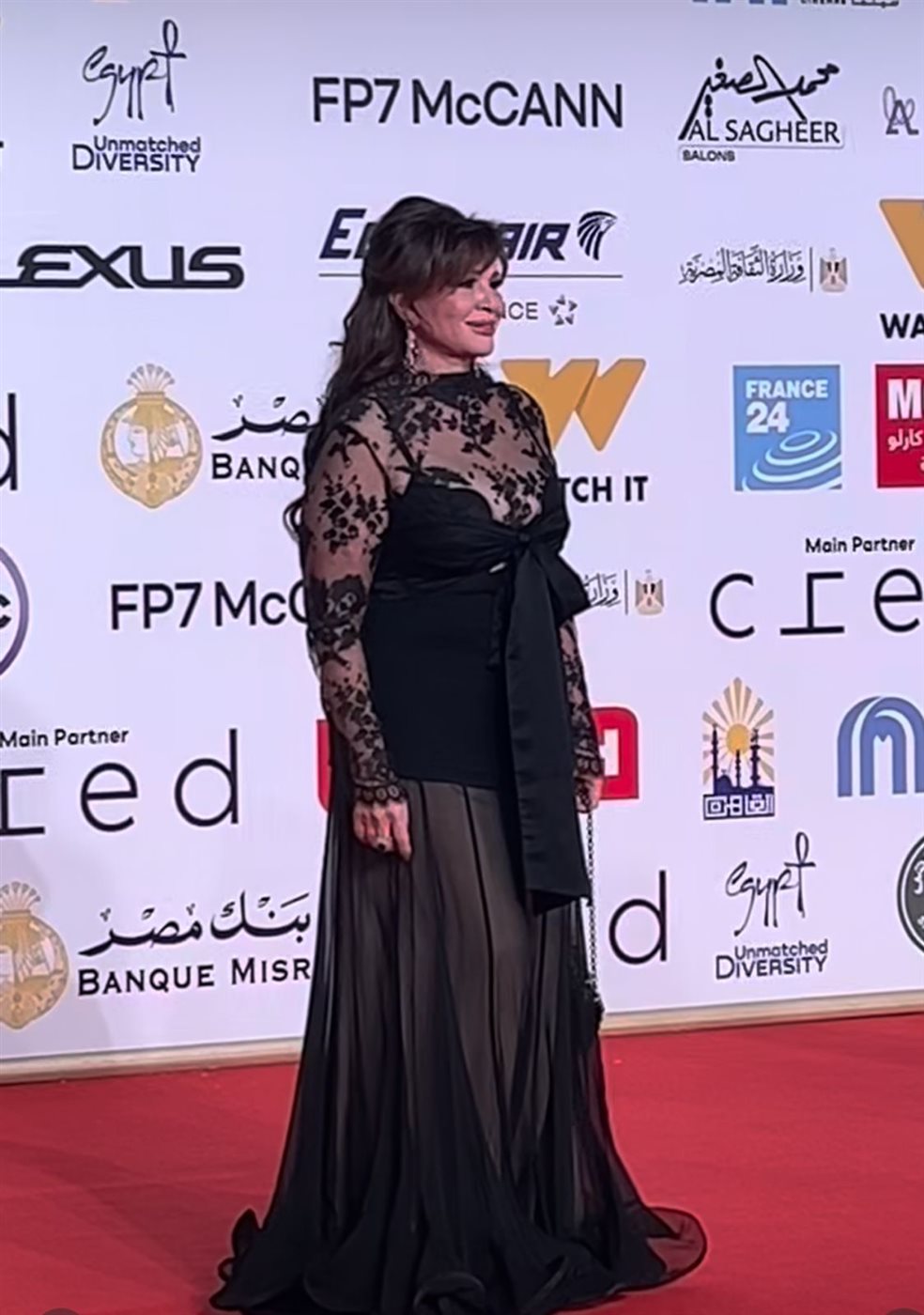 وارتدت الفنانة إلهام شاهين فستانا أسود اللون وجريئا ومكشوفا يتميز ببطانة قصيرة وشفافاً.