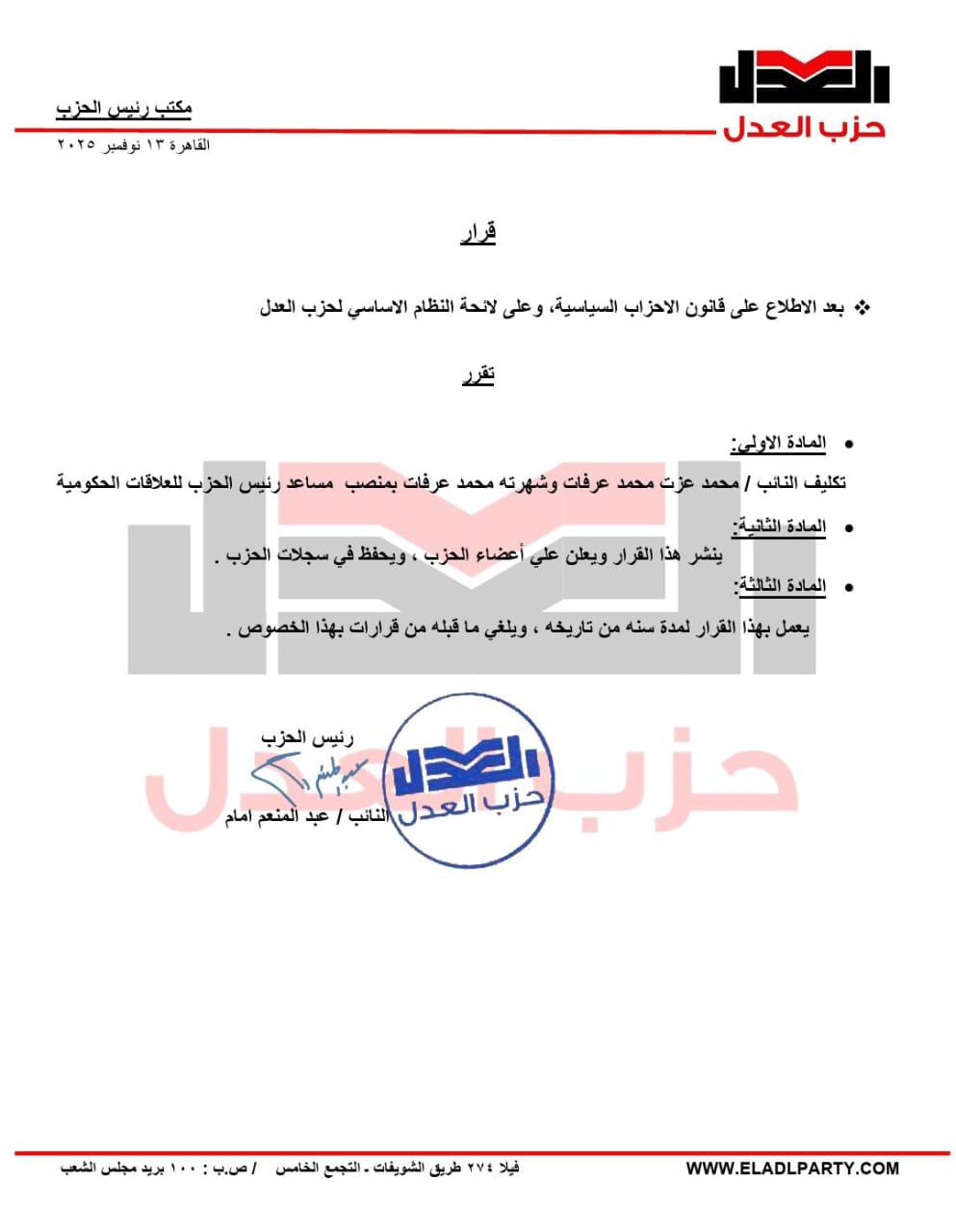 سيتولى النائب محمد عزت عرفات الاشراف على ملفات التواصل مع مؤسسات الدولة، ودعم جهود الحزب في القضايا التشريعية والسياسات العامة التي تمس حياة المواطن المصري، بما يتماشى مع مبادئ حزب العدل واستراتيجيته