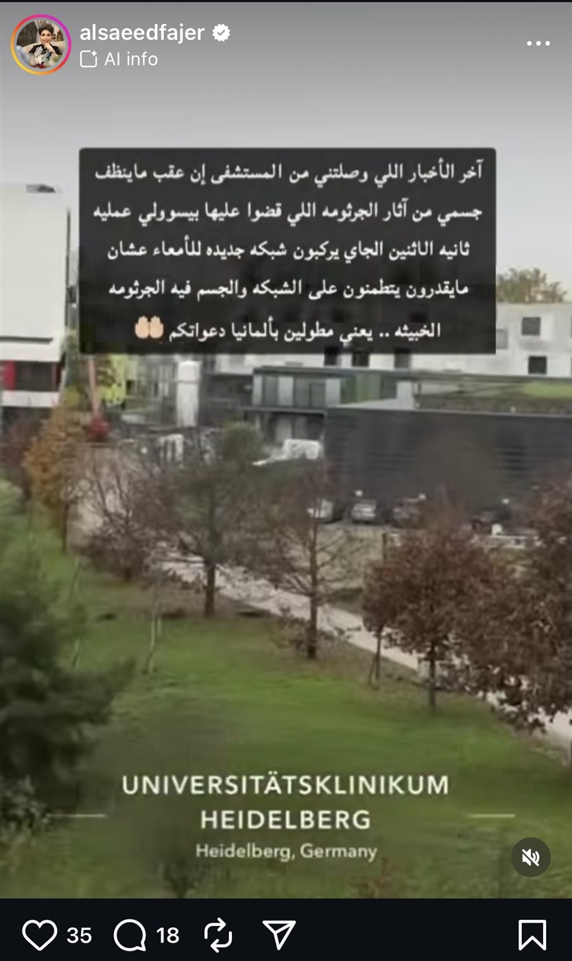 وقالت فجر السعيد في منشورها: “صباح الخير على كل المتابعين من كل مكان .. شكرا على سؤالكم عني وحرصكم على الإطمئنان علي الحمدلله الأمور طيبة بس امس كنت طول الوقت مخدرة لان العملية شوي كانت صعبة امعاء وجرثومة والتهاب واصل للقفص الصدري يعني سردوا بطني تسرّد وحطولي فاكيوم لسحب الخراج لازلت بالعزل وعلي برابيش بكل صوب ممنوع تحرك وحتى الآن لم يحضر اي دكتور ليشرحلي تفاصيل العملية رغم ان الساعة في ألمانيا تقترب من التسع صباحا والبارح قالولي بعد السبع يجيج الدكتور ماشفت احد دزيتله مسج قالي الحين اجيج وناطرته”.
