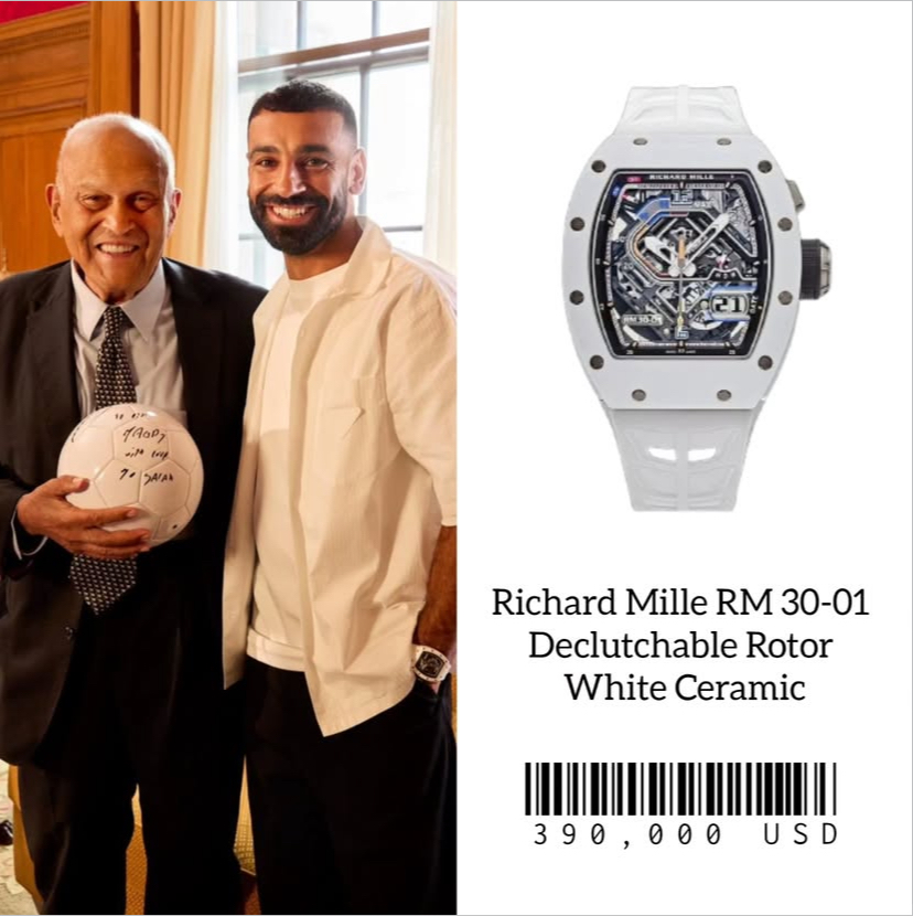 ارتدى محمد صلاح، ساعة بتوقيع ريتشارد ميل RM 30-01 مصنوعة من السيراميك الأبيض يبلغ سعرها حوالي 390,000 دولار.