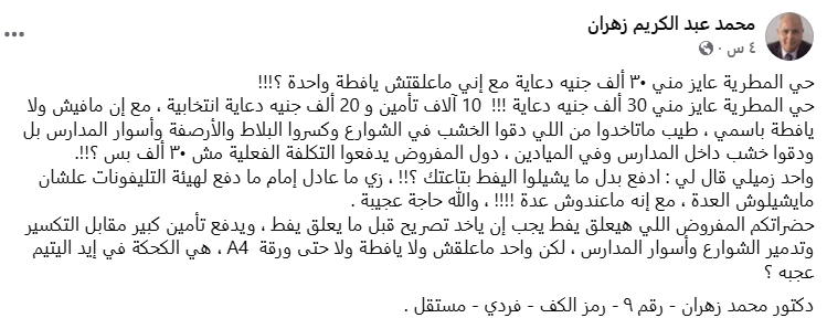 وأختتم محمد زهران، مرشح مجلس النواب منشوره قائلًا: زميل قال لي ادفع بدل ما يشيلوا اليفط بتاعتك، زى ما عادل إمام دفع لهيئة التليفونات علشان ما يشيلوش العدة رغم إنه معندوش عدة.. والله حاجة عجيبة.