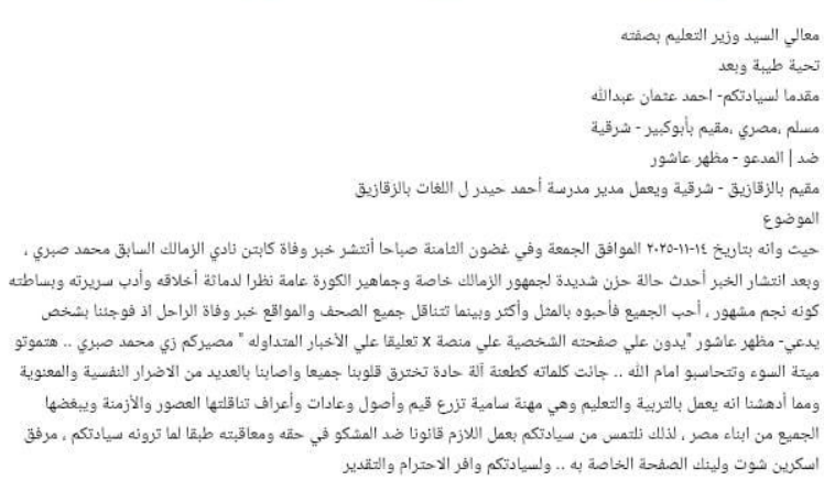 تقدم المحامي أحمد عثمان عبد الله، بشكوى رسمية إلى وزارة التربية والتعليم ضد مظهر عاشور، مدير مدرسة أحمد حيدر للغات بالزقازيق، على خلفية منشور متداول عبر منصة إكس، يسب فيه لاعب نادي الزمالك السابق محمد صبري، عقب تداول خبر وفاته صباح يوم الجمعة.