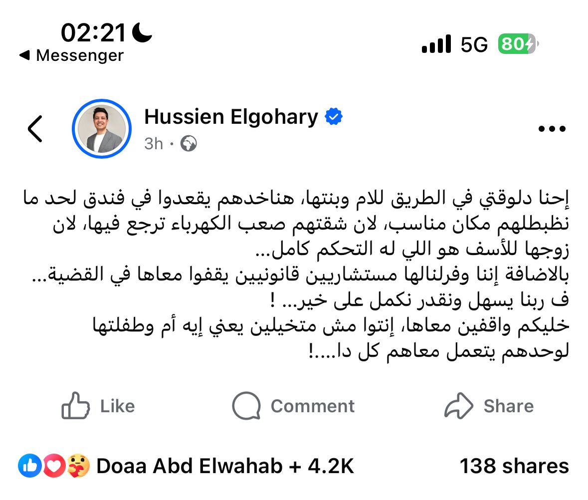 نشر الانفلونسر حسين الجوهري عبر حسابه الخاص على موقع التواصل الاجتماعي “فيسبوك" قائلًا “إحنا دلوقتي في الطريق للام وبنتها هناخدهم يقعدوا في فندق لحد ما نظبطلهم مكان مناسب لان شقتهم صعب الكهرباء ترجع فيها لان زوجها للاسف هو اللي له التحكم كامل، بالاضافة إننا وفرنالها مستشاريين قانونيين يقفوا معاها في القضية فلابنا يسهل ونقدر نكمل على خير خليكم واقفين معاها إنتوا مش متخيلين”.