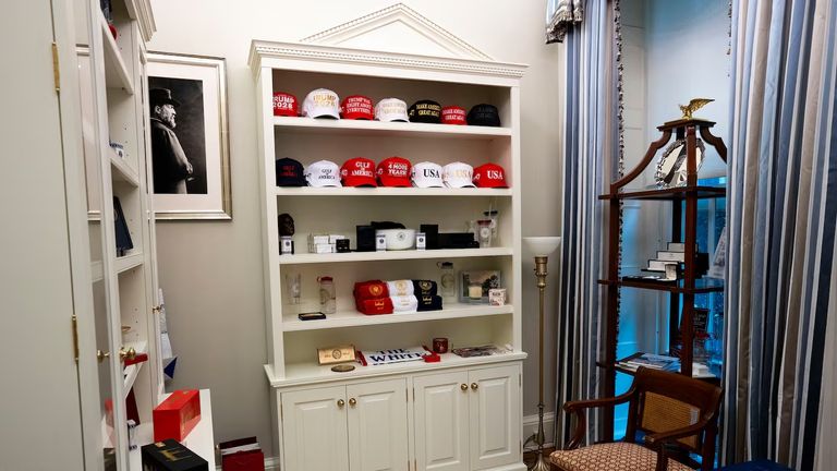 وحول الرئيس الأمريكي، دونالد ترامب هذه الغرفة، بدلًا من أن تكون مساحة للعمل، إلى ما يشبه غرفة عرض شخصية أو متجر هدايا صغير مكرس بالكامل لعرض رموز مرتبطة به شخصيًا وسياسيًا.