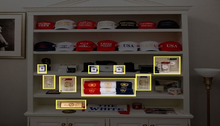 ويعرض ترامب أيضًا على الرفوف علب كبريت، دبابيس، وزجاجات مياه تحمل توقيعه أسفل الختم الرئاسي، ومنتجات عطور "Victory 45–47"، وكتبًا تناولت مسيرته السياسية، في خطوة تعكس رغبته في تحويل الغرفة إلى قاعة هدايا رمزية تتبدل محتوياتها وفقًا لرغباته وما يريد عرضه لضيوفه.