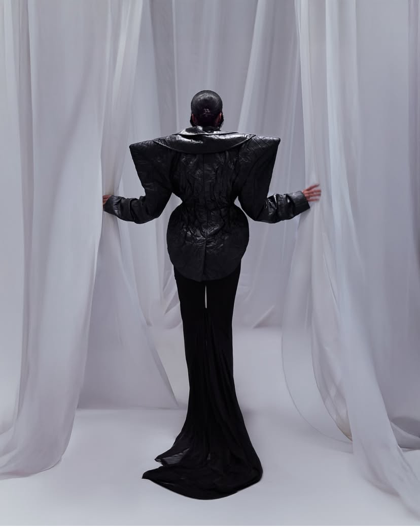 ارتدت الفنانة غادة عبدالرازق فستان أسود اللون منسق مع معطف جلد أسود أيضًا يتميز بأكتاف مدببة ودراماتيكية كبيرة الحجم.
