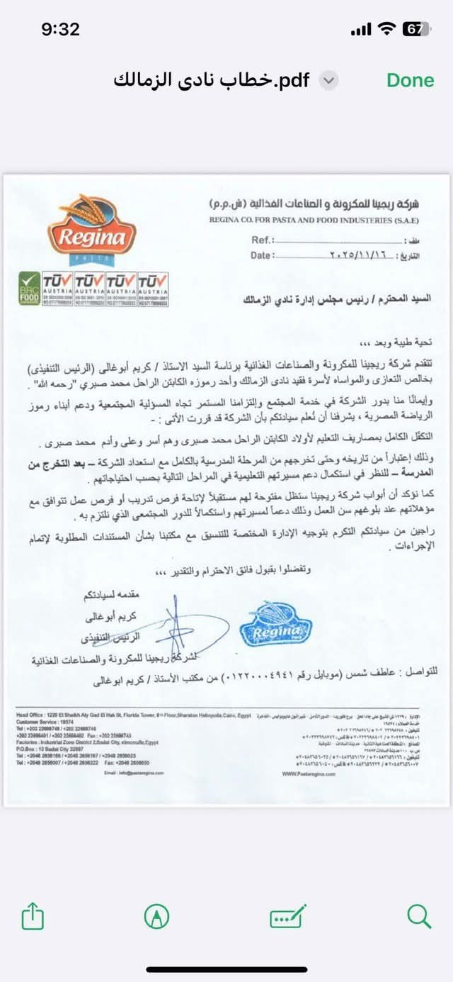 أعلنت شركة ريجينا للمكرونة والصناعات الغذائية التكفل الكامل بالمصروفات الدراسية لأبناء لاعب الزمالك الراحل محمد صبري، الذي توفي قبل يومين إثر حادث كبير.