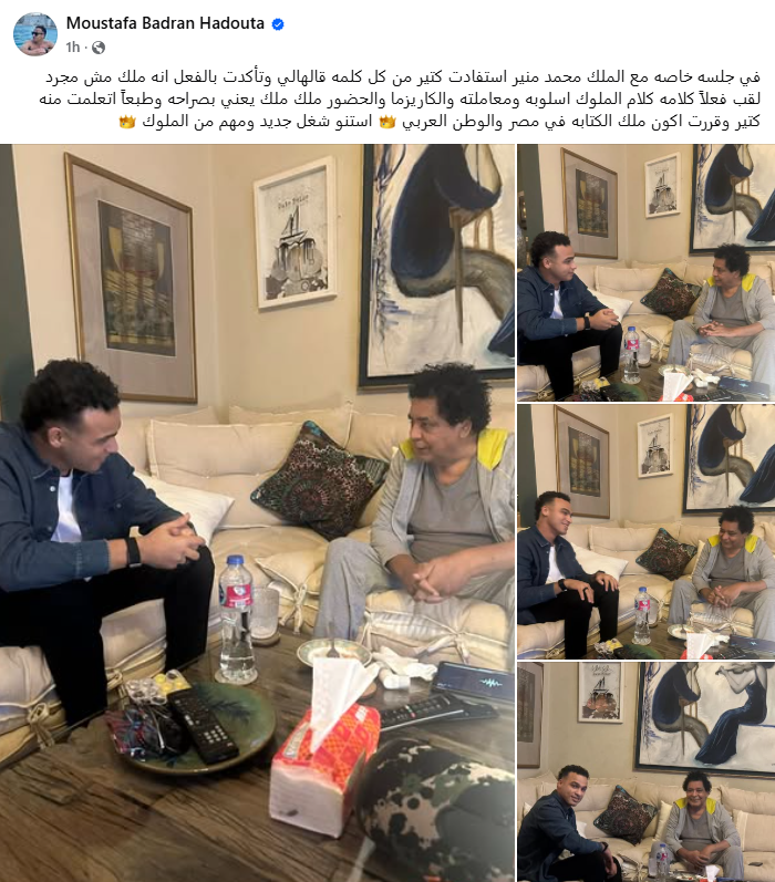 وقال مصطفى حدوته معلقًا: “في جلسة خاصة مع الملك محمد منير، استفادت كتير من كل كلمة قالهالي وتأكدت بالفعل أنه ملك مش مجرد لقب فعلاً كلامه كلام الملوك أسلوبه ومعاملته والكاريزما والحضور ملك ملك يعني بصراحة، وطبعاً اتعلمت منه كتير، وقررت أكون ملك الكتابة في مصر والوطن العربي، استنو شغل جديد ومهم من الملوك”.