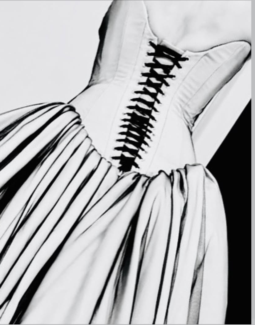 واختارت النجمة العالمية فستاناً أنيقاً باللونين الأسود والفضّي، جاء من الأعلى بدون أكمام ومكشوف الصدر بقصة جريئة تبرز مفاتنها، وينسدل من الأسفل بتصميم مجسّم يبرز رشاقتها، وتخلل الفستان قماش من المخمل الأسود، والذي تم دمجه بأسلوب أنيق من الخلف بقماش لامع باللون الفضّي، جاء على شكل كورسيه من الأعلى وينسدل بأسلوب تنورة منفوشة وطويلة من الأسفل بقصة الأميرات، وهو ما أضاف لمسة من الفخامة والأناقة الى إطلالتها. وأضيفت الى التصميم قفازات سوداء طويلة.