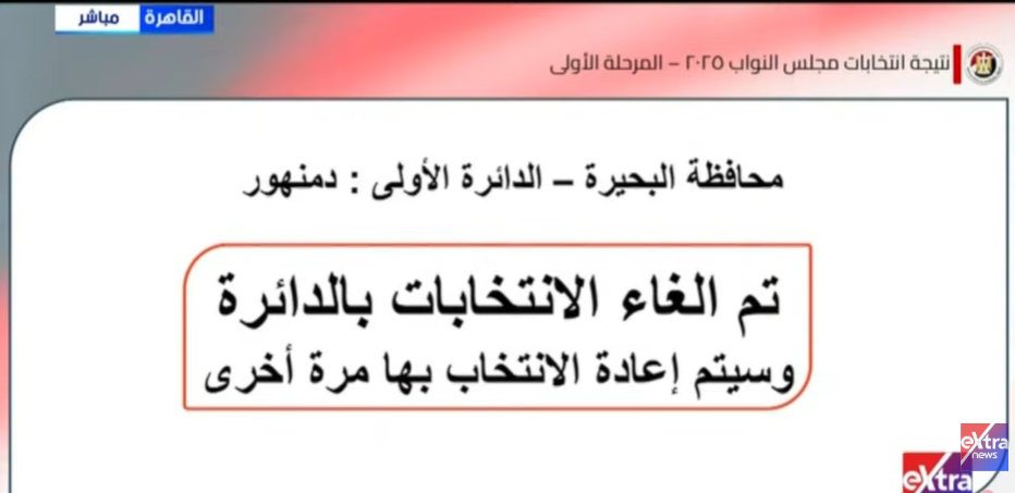 أعلن المستشار حازم بدوي رئيس الهيئة الوطنية للانتخابات، عن إلغاء الانتخابات في الدائرة الأولى بمحافظة البحيرة بقسم دمنهور، مشيرا إلى أنه إلغاءا كليا.