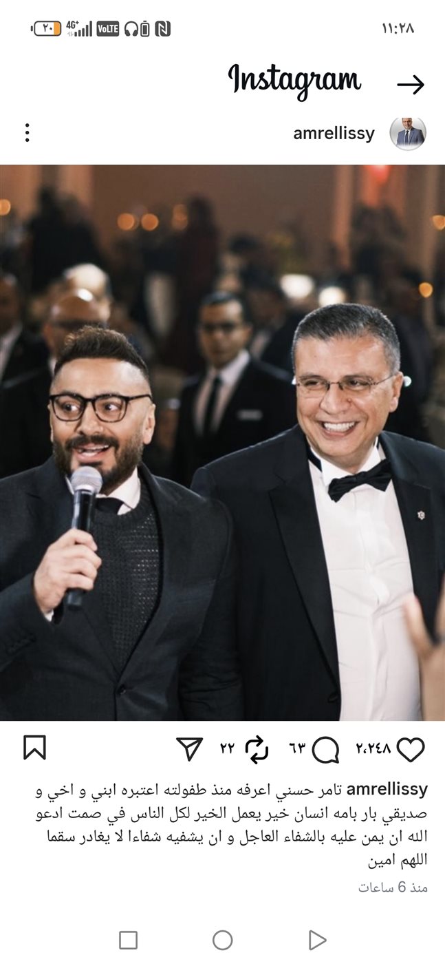 شارك الإعلامي عمرو الليثي متابعيه على موقع إنستجرام صورة تجمعه بالفنان تامر حسني، وأرفقها برسالة مؤثرة يدعو فيها للمطرب بالشفاء العاجل.