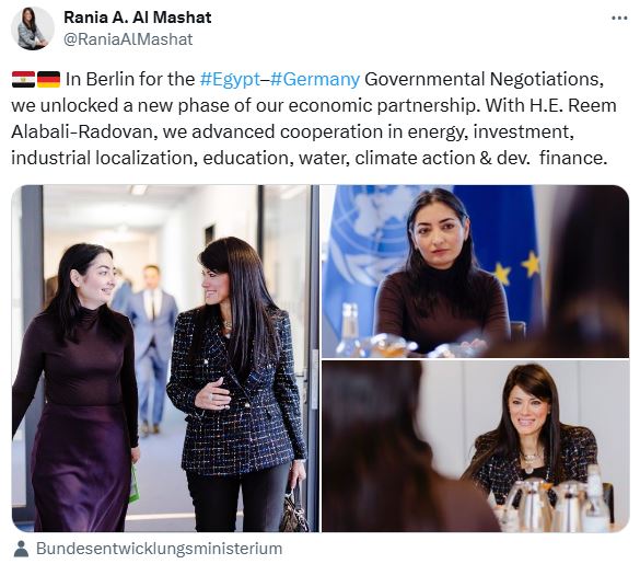 وجاء ذلك عبر تغريدة نشرتها على صفحتها الرسمية بمنصة "إكس" قائلة :من برلين، خلال المفاوضات الحكومية بين مصر وألمانيا، انطلقنا بمرحلة جديدة من شراكتنا الاقتصادية. ومع معالي الوزيرة ريم العبالي-رادوفان، عززنا التعاون في مجالات الطاقة، والاستثمار، والتوطين الصناعي، والتعليم، والمياه، والعمل المناخي، وتمويل التنمية.