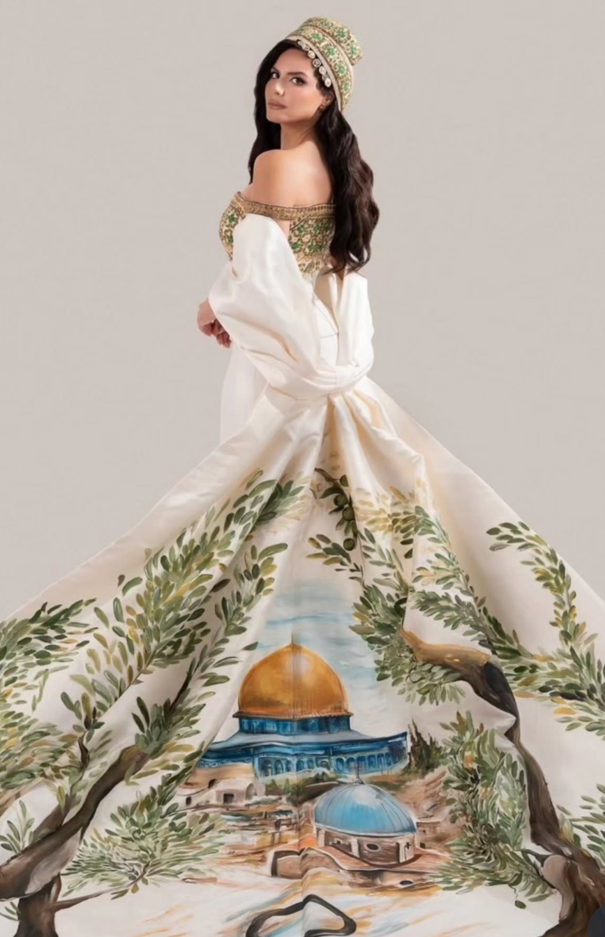 الفستان له رموز ومعاني أبرزها هو العاج وهو رمز للنقاء والخير والتطريز الذهبي والأخضر مستوحى من القرى الفلسطينية وتاريخها العريق والتاج مستلهم من الزي التقليدي الفلسطيني المعروف باسم الشتوة والعباءة المرسومة يدوي تحتفي بوحدة وتعايش المسجد الأقصى وكنيسة القيامة وشجرة الزيتون رمز السلام والانتماء للأرض الفلسطينية.